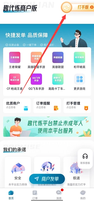 1. 在首页右上角点击,即可实现商户版与打手版的切换,接下来我们切换至商户版。