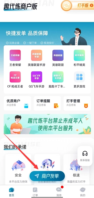 2. 在商户版首页的最底部,点击【商户发单】,或者也能够选择点击相关游戏。