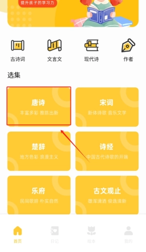 1、唐诗宋词板块,用户可以通过该功能查看经典唐诗宋词,引导孩子记忆重要的文化作品,提升语文素养。
