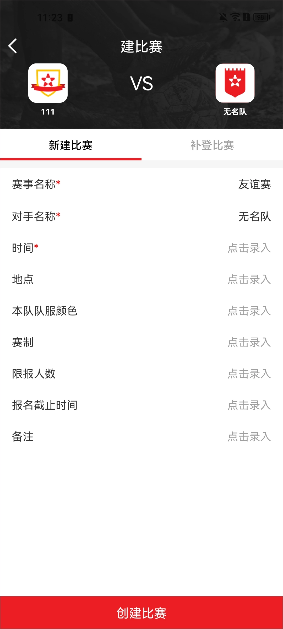 3、进入新建比赛页面,填写比赛相关信息,完成后点击“创建比赛”即可。需要注意的是,创建比赛的前提是必须拥有球队。