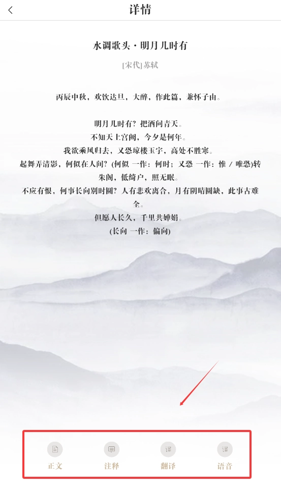 2、诗词库包含三百余首经典作品,每首附带创作背景、名家评注和朗诵音频,支持按朝代、作者、题材等多条件检索。