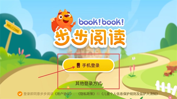 打开这款儿童阅读类工具应用后,会进入登录页面,你可以选择【手机登录】或者其他登录方式,不过在登录之前需要先同意相关协议。