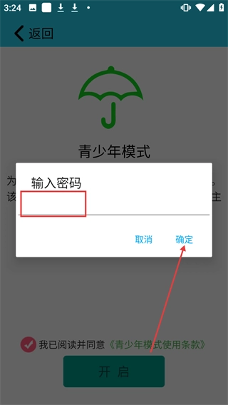 在【输入密码】弹窗中输入密码,接着点击【确定】按钮,这样就能完成青少年模式的设置了。