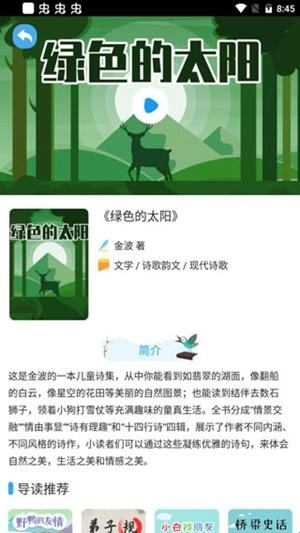 丰富资源:涵盖小学至高中阶段的阅读材料,包含各类经典名著、儿童文学、科普读物等。2.导读功能:通过专业导读解读经典作品,助力孩子更深入地理解书籍内容。