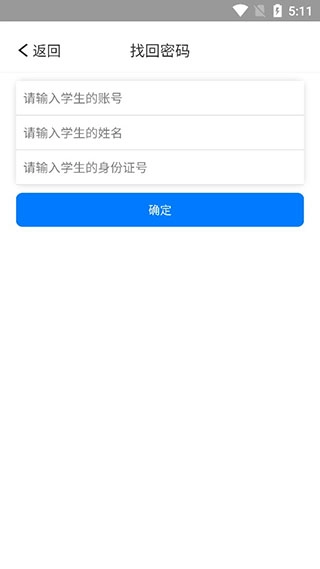 要找回学生信息,需输入学生账号、姓名及身份信息,然后点击确定按钮。