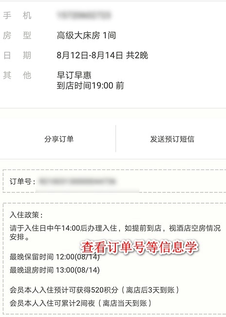 打开之后,我们就能查看到详细的信息,包括预订时间、酒店地址、预留电话等内容。