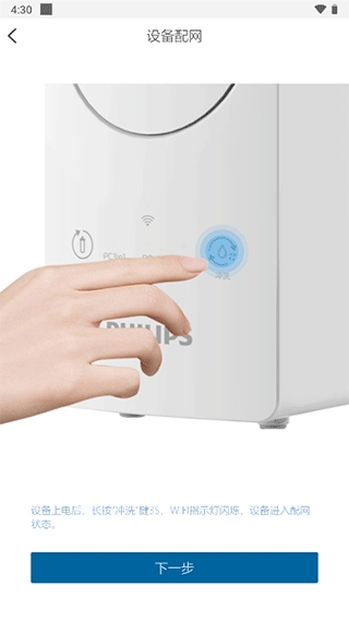 1、设备上电后,长按“冲洗”键3S,WIFI指示灯闪烁,设备进入配网状态。