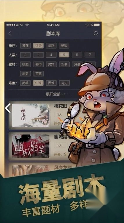 玩家还可以在剧本库中选择各种的剧本题材,比如校园、都市、灵异、军事等等,此外还可以选择不同的难度、人数、评分等内容进行游戏。