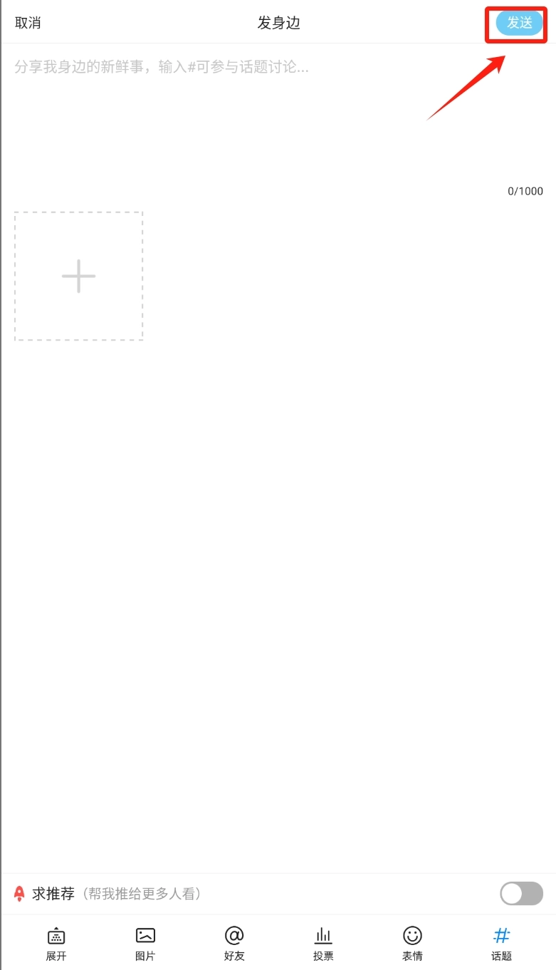 3、此时便能够着手填写文章的详细内容,同时上传一些照片进行阐释,还能添加话题,提升文章的热度,最后点击发送按钮就行。