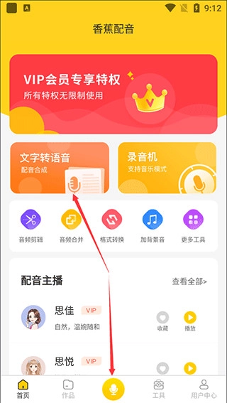 1、通过本站香蕉配音并打开,在首页点击“文字转语音”或下方的“话筒”按钮即可合成配音;