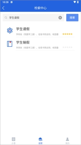 3、点击底部导航栏的搜索按钮,在搜索框中输入“学生请假”,系统会检索出对应的学生请假业务,之后点击该业务即可。