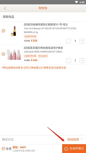 2、进入购物车后,点击“生成并提交”这一选项,接着挑选合适的付款方式进行付款就行。
