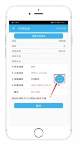 3、注册并登录成功后,在需要乘车时,打开“西安公交出行”后通过点击“+”按钮,进入信息填报页面,填写乘车线路、上车站点、车辆编号及体温情况,其中乘车线路及车辆编号可通过点击“扫一扫”后,扫描车辆二维码自动获取(可询问工作人员如何扫描),也可手动填写,填写完成后需要工作人员确认无误后方可提交信息,如有疑问可咨询现场工作人员。