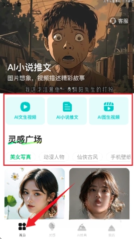 3、当你进入软件主界面,会看到“AI文生视频、AI小说推文、AI图生视频以及灵感广场功能”等诸多选项。