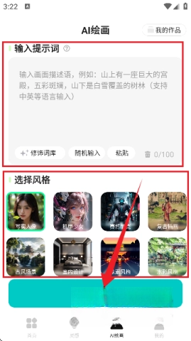 5、尝试“AI绘画”功能,只需输入提示词和选择风格,点击开始绘制就可以了!