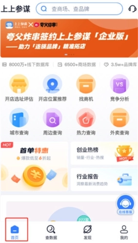1、在本站打开上上参谋后,点击软件进入首页,能看到开店选址评估、开店位置推荐、城市查询、周边查询等诸多功能;