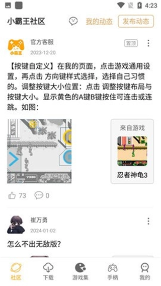 小霸王模拟器是一款模拟器软件,它汇聚了海量怀旧街机游戏资源。像魂斗罗系列、坦克大战、超级玛丽、冒险岛系列、忍者神龟系列等游戏,在这里一应俱全。你能够通过在线搜索,轻松找到各类想玩的经典游戏。不仅如此,该模拟器还具备社区功能,方便你与志同道合的伙伴在线交流,分享彼此的游戏经验。