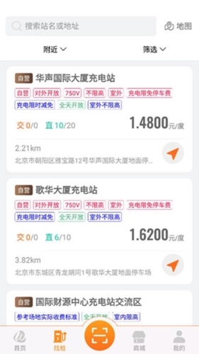 4、除了首页推荐的充电桩外,大家还能依据自身所在位置,筛选出离自己最近的充电桩。