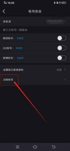 3、在这里我们就能看到“注销账号”的选项了,点击它;