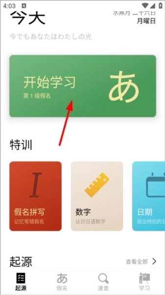 1、进入首页后,能够设置今日学习计划、特训、起源等内容,随后点击开始学习即可。