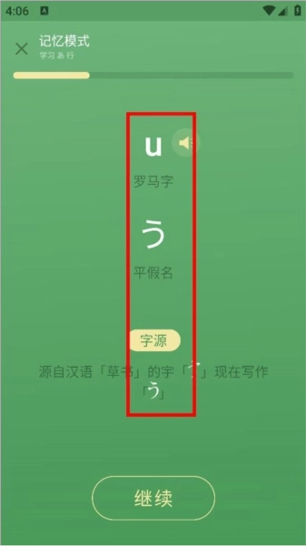 3、启动学习记忆模式测试,用户依据系统提供的罗马字、平假名以及汉语字源展开学习。