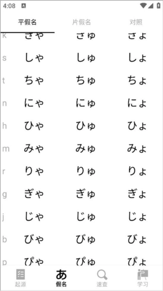 4、打开假名页面后,用户能够学习平假名与片假名的清音、浊音以及拗音。