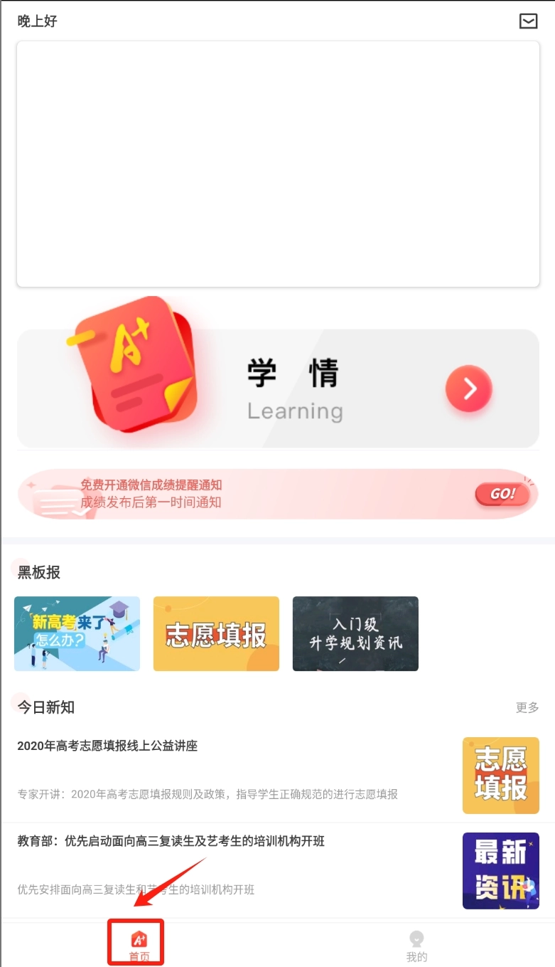 1. 在首页板块,能够查看大量与学习相关的信息,其中包括学情信息、志愿填报信息等。