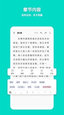 2、章节内容提供全文复制、字体大小和间距、查找并替换、护眼主题、图片分享等功能;
