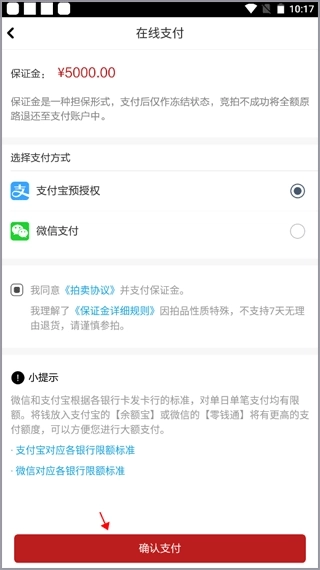 5、此保证金属于担保性质,是参与竞拍所需缴纳的费用;若未成功竞拍,将全额退还用户。点击下方“确认支付”按钮,即可参与竞拍。