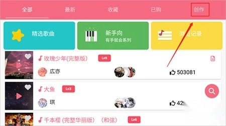 2、在歌曲列表中,切换到“创作”选项卡。