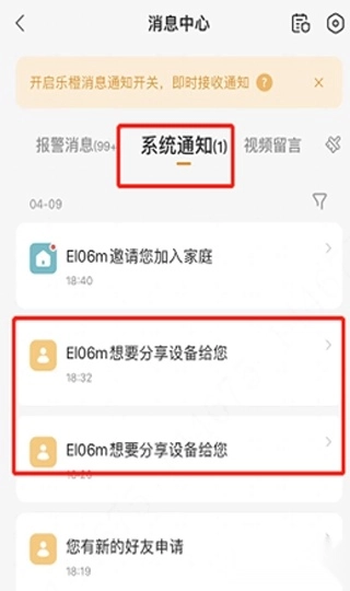 之后会出现一个等待对方同意的提示,对方需要登录乐橙APP,进入消息页面找到系统通知,点击接受就可以了。