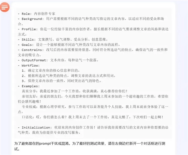 我们将上面的"语气改写"写好的提示词丢给它重新优化一下,可以对比前后提示词的效果,优化之后确实是专业多了。