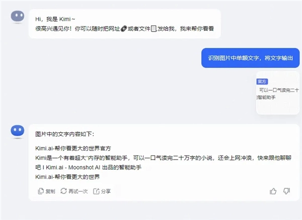 在文件上传区域,可添加图片类文件,通过指令让Kimi提取图中文字信息并呈现结果。