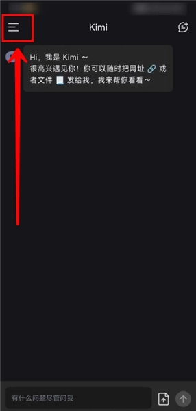 启动Kimi智能助手应用后,找到界面左上角那个由三条平行横线组成的菜单按钮并点击它。