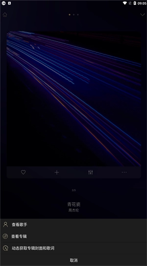 播放界面还具备均衡器调节、收藏功能,以及查看歌手信息、专辑详情、动态获取专辑封面和歌词等功能。