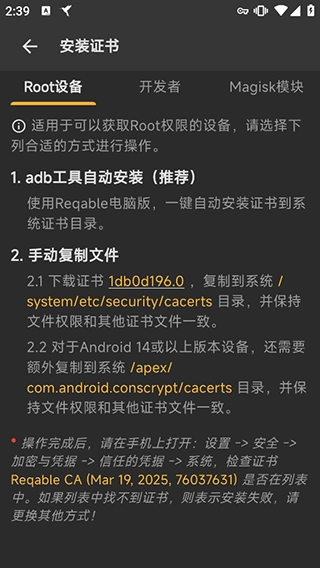 若用户不愿通过远程方式安装证书,也可选择导入存储在手机本地或电脑中的证书文件来完成安装流程,不过在此之前,仍需先对手机设备执行root操作。