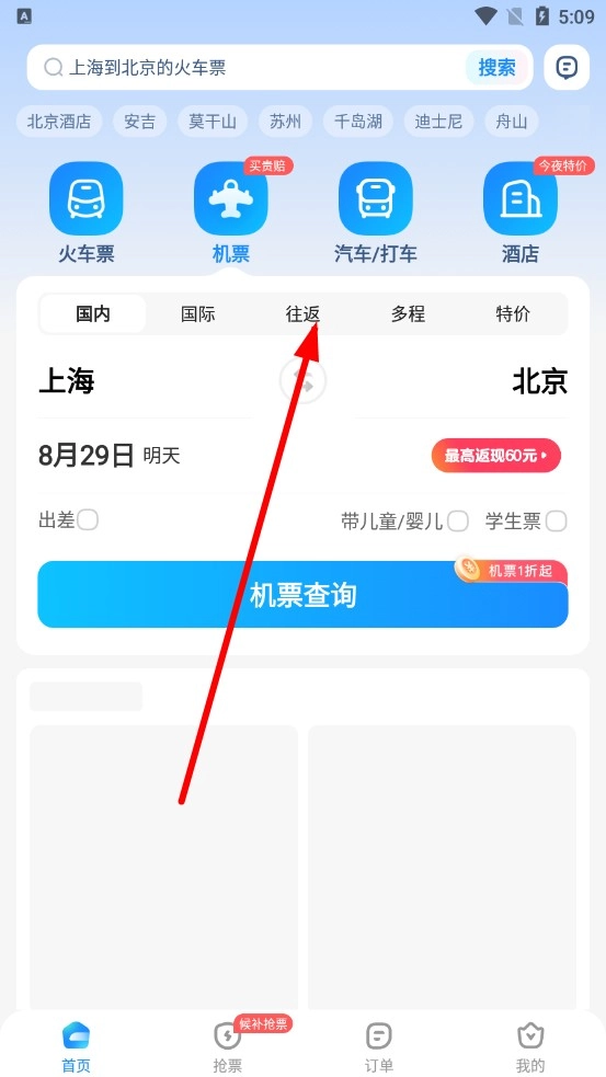 在预订页面,点击往返选项,选择往返航班。