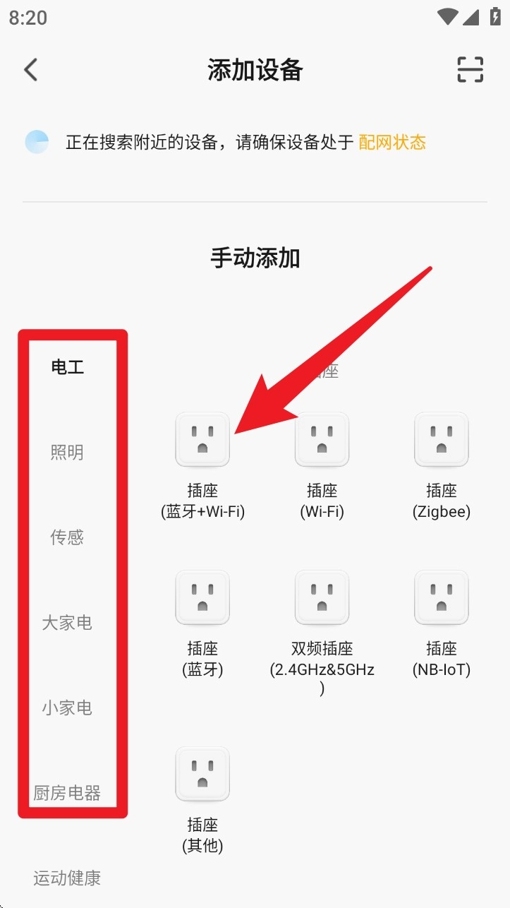 在“添加设备”页面挑选插座品类,可兼容蓝牙、Wi-Fi、Zigbee等多种协议方式进行连接。