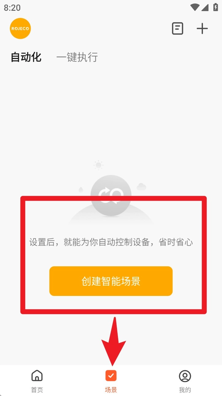 切换到“场景”页面后,点击“创建智能场景”选项,就能自行设置自动化操作,进而提升日常使用的效率。