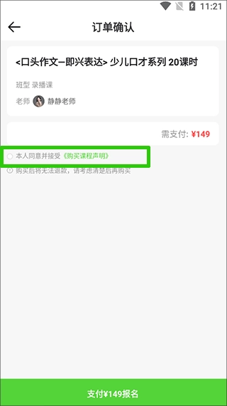 接着在此处确认信息无误后,勾选绿色方框里的“本人同意并接受《购买课程声明》”,再点击下方的支付按钮。