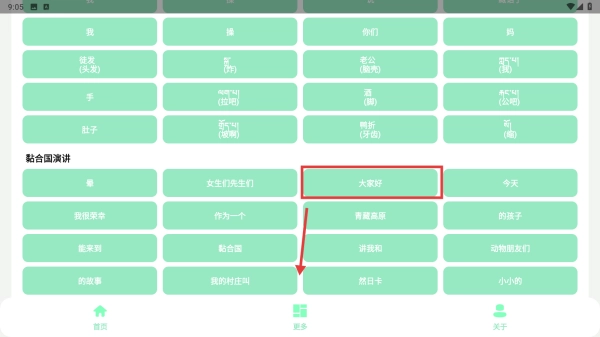 在更多内容页面,点击“大家好”等语音相关内容,接着向下浏览查看功能。