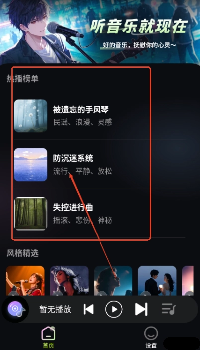 丰富曲库:软件内含热播榜单、风格精选等多种歌单,播放列表一目了然,助你轻松发掘热门歌曲与最新音乐,适配不同用户的各类听歌场景。