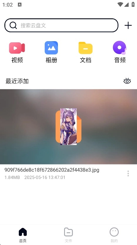 用户打开X云盘后,在首页就能看到视频、相册、文件、音频这些板块,以及最近添加的文件区域。
