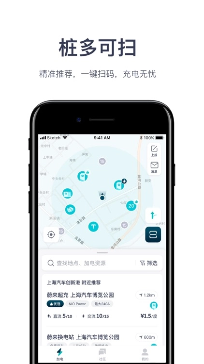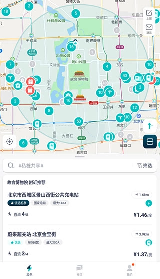 当您允许系统获取位置信息后,我们会为您展示周边可用的充电设施,并同步更新它们的当前使用情况。