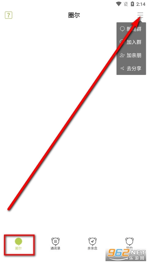 首先创建一个群组,在圈尔的首页界面,点击右上角的功能按钮,这和微信、QQ等平台创建群组的操作流程基本相同。