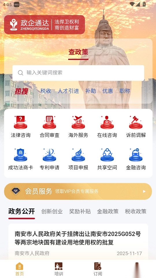 政企通达最新版,是一款一站式法律商务服务软件。它涵盖法律咨询、合同审查、海外服务、诉前调解、专利申请等全方位法律商务服务。用户可在此领取 VIP 会员,解锁更全面的服务使用权限。同时,软件还会全面推送各类政务信息、税收政策、金融政策以及创新创业的最新动态,方便用户及时发现最新政策,助力企业及时申报。用户若有法律问题,能向专业律师咨询,获取法律援助,一站式解决商务法律难题。此外,软件还推荐线上线下的各类培训活动,用户可随时报名参加,学习更多专业知识。有需要的用户,快来政企通达免费版体验吧!