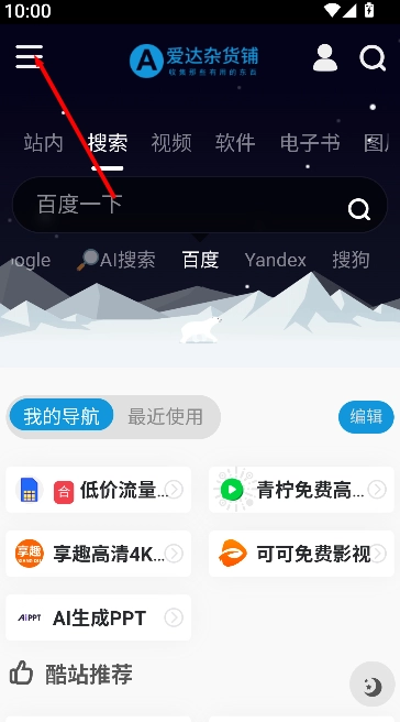 1. 开启《爱达杂货铺》软件,于首页左上角寻觅呈现三横样式的菜单图标,随后点击该图标,即可展开涵盖各类功能分类的侧边菜单。