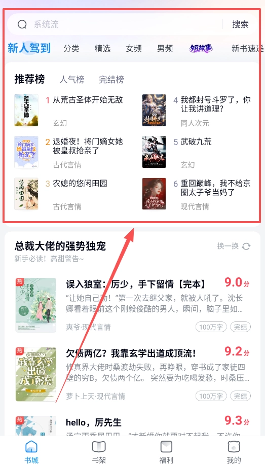 2、在找书阅读的时候,书城里有着清晰的分类,比如玄幻、言情等。榜单上的书籍,像《退婚夜:将门嫡女》就相当热门。