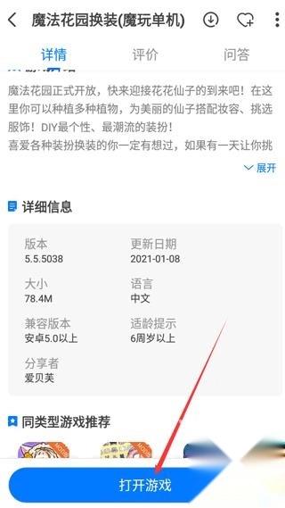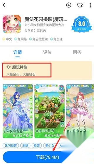这里我挑选了魔法花园换装游戏,能看到已经调整为海量金币、海量钻石,接着点击最底部的就可以了。