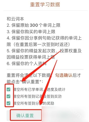 勾选想要重置的内容后,点击“确认重置”按钮,就能重新开始背单词了。